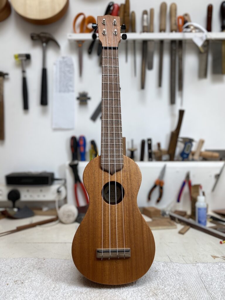 This one is all mahogany with a walnut fingerboard and black saddle and nut. The sound it delivers is huge with a long sustain (for a ukulele). It has 17 frets, and the neck meets the body at the 15th fret. Der Jung geared tuners and Aquila tenor strings.
