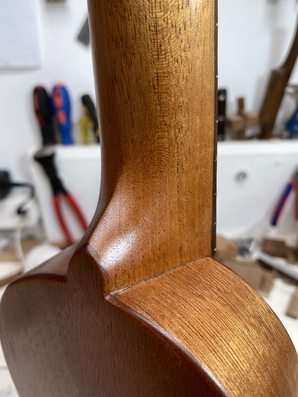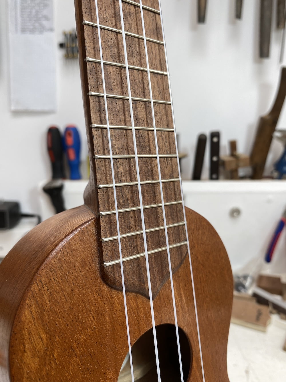 A tenor uke scale neck on a soprano uke body for those who love that classic soprano ukulele shape but find the soprano fret spacing a bit too tight. Because the neck meets the body at the 15th fret it allows easy access to the top end of the fretboard. This ukulele gives you the benefits of tenor fret spacing on a soprano body - in my mind the best of both worlds...