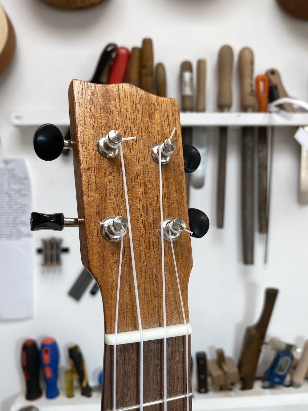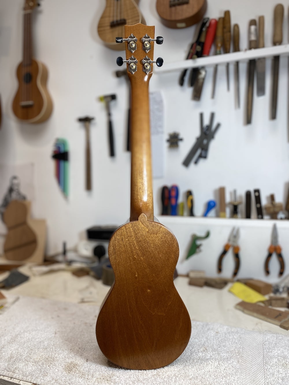 This one is all mahogany with a walnut fingerboard and black saddle and nut. The sound it delivers is huge with a long sustain (for a ukulele). It has 17 frets, and the neck meets the body at the 15th fret. Der Jung geared tuners and Aquila tenor strings.
