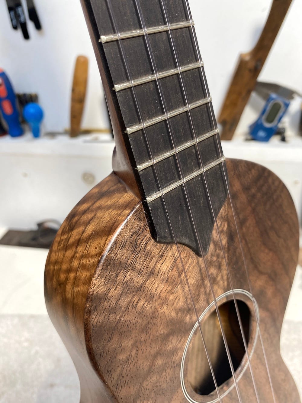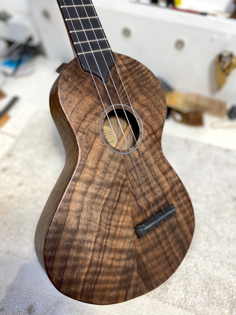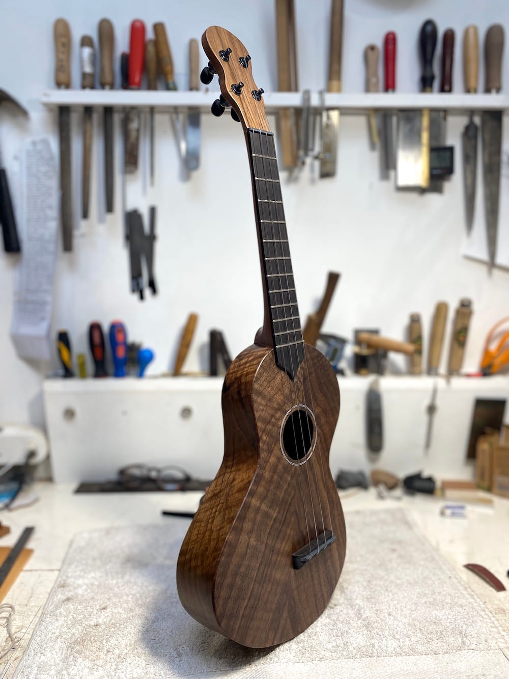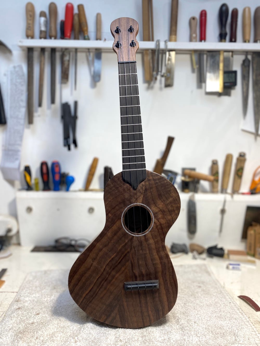 A wonderful tenor wonkylele in all walnut. Its thinner body does nothing to inhibit its volume (plus it fits through a letterbox).