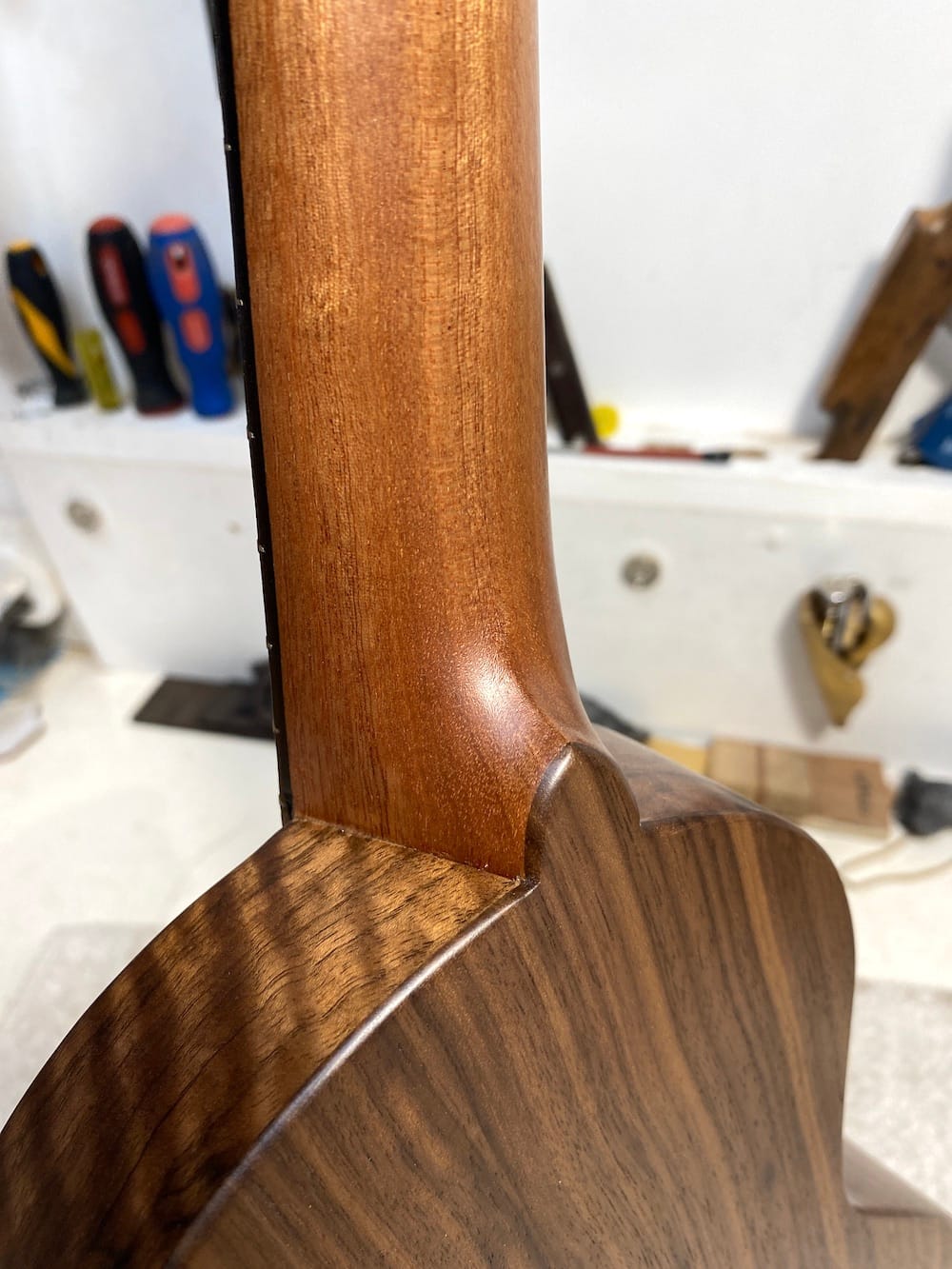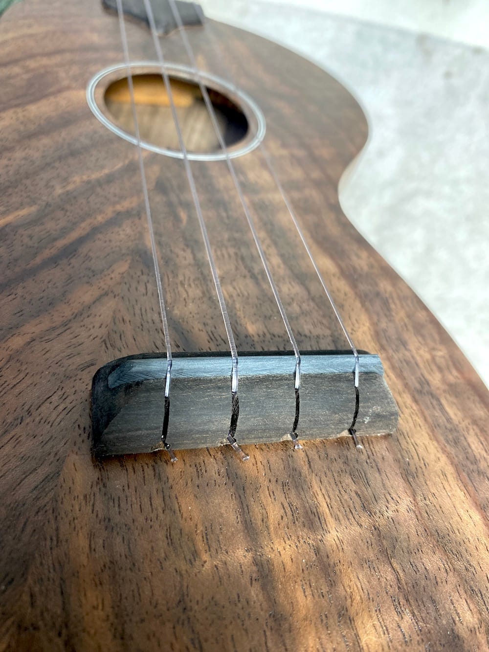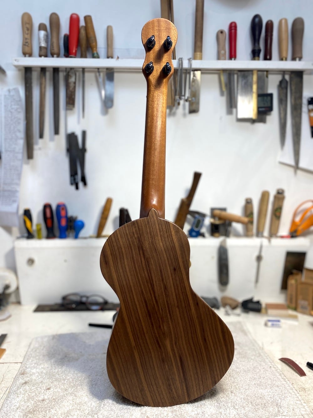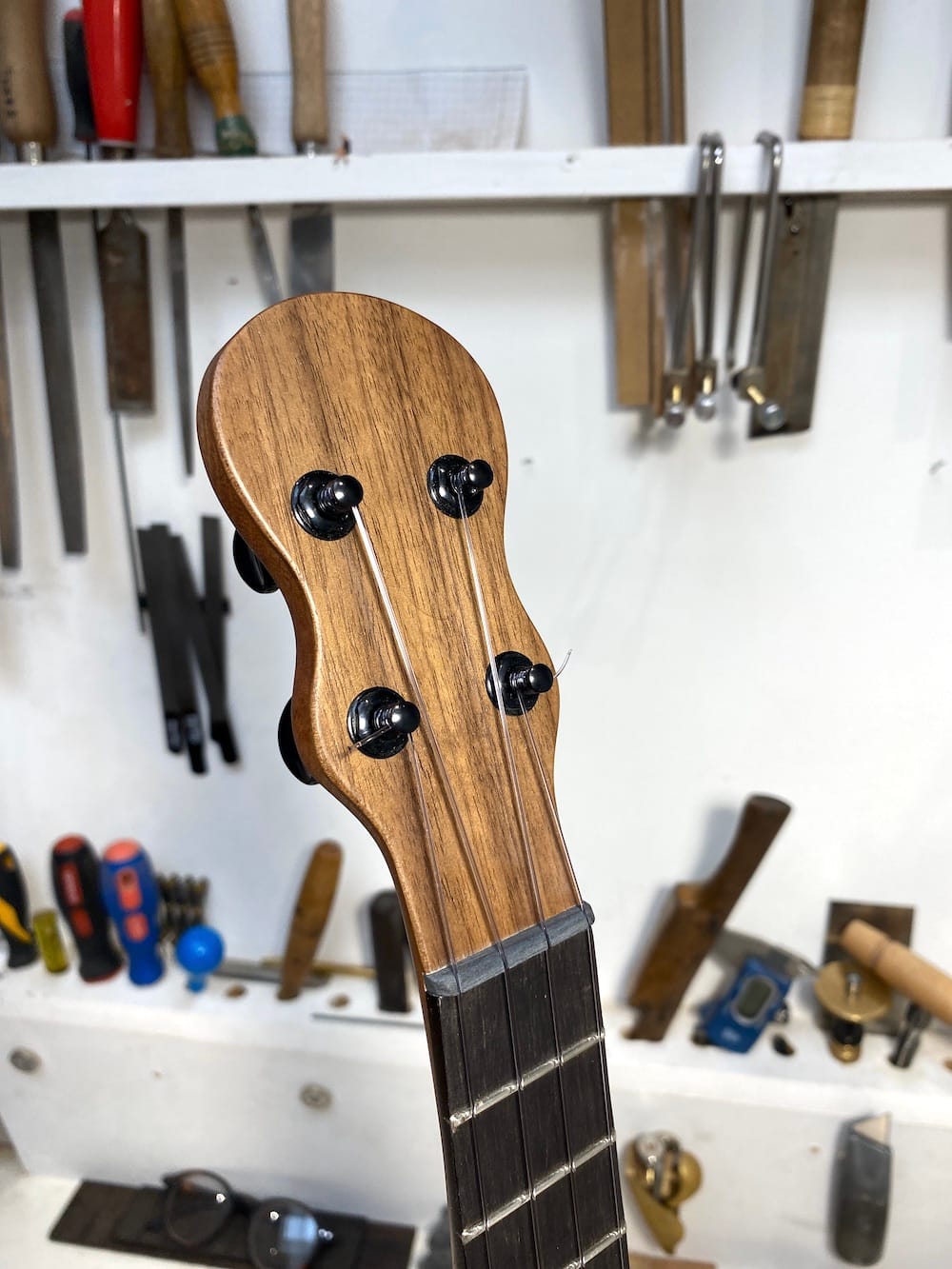 A wonderful tenor wonkylele in all walnut. Its thinner body does nothing to inhibit its volume (plus it fits through a letterbox).