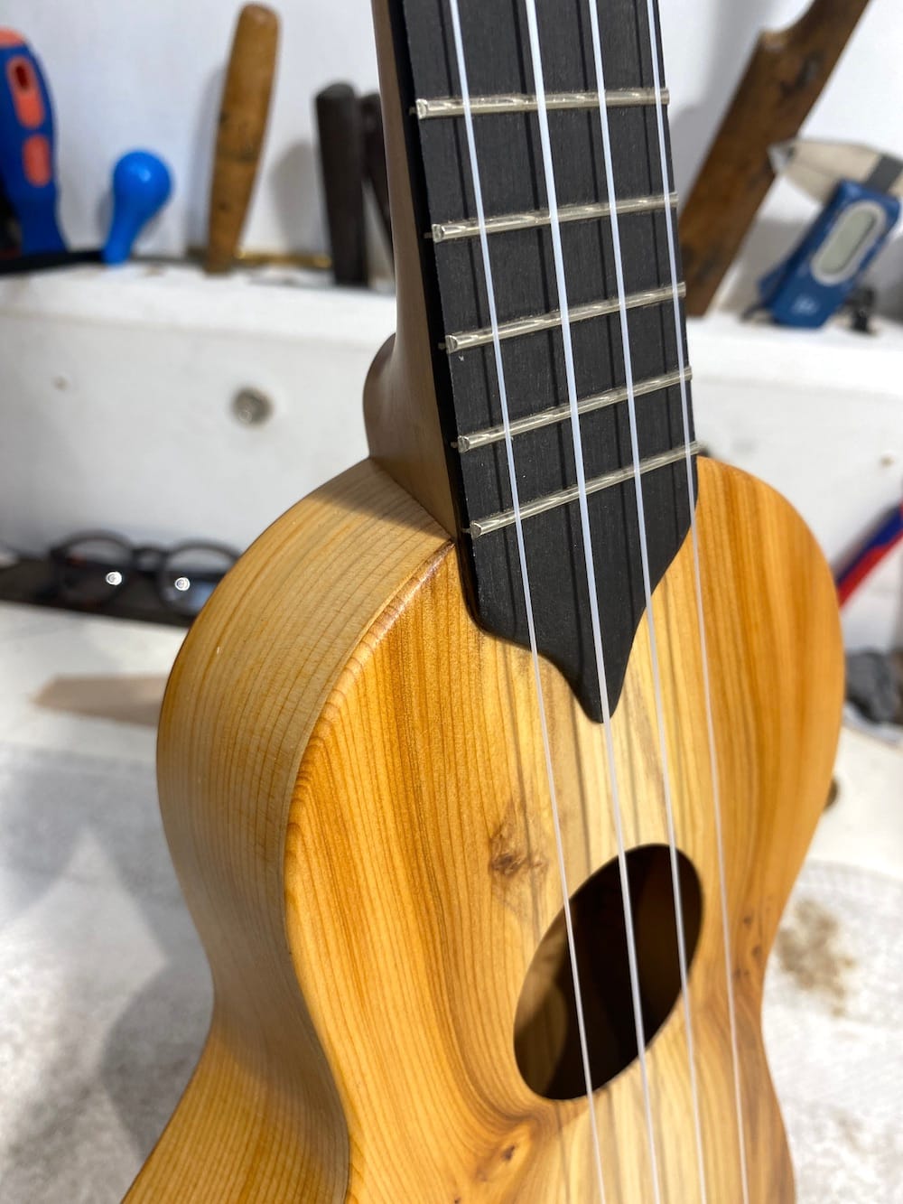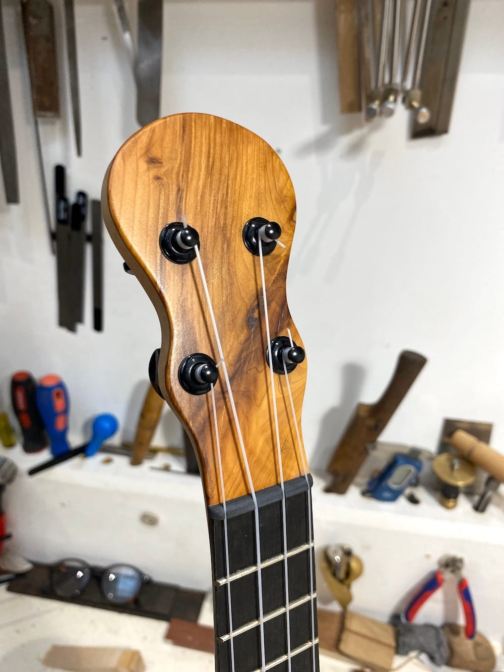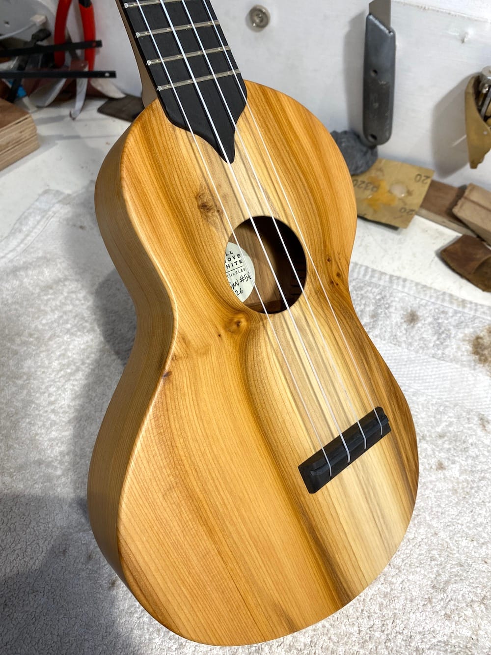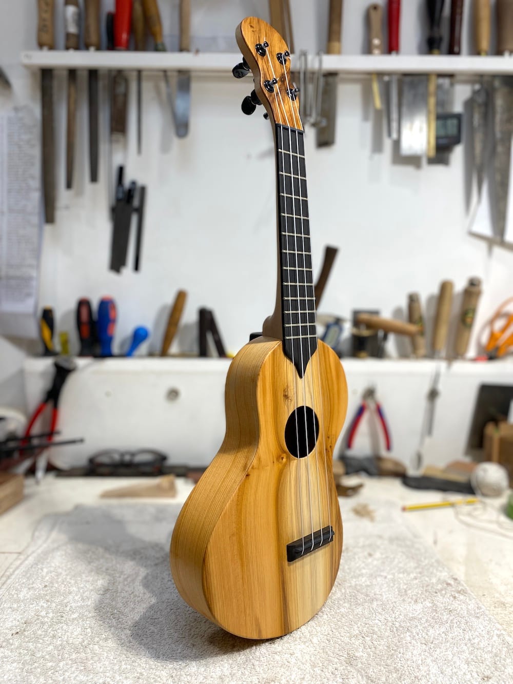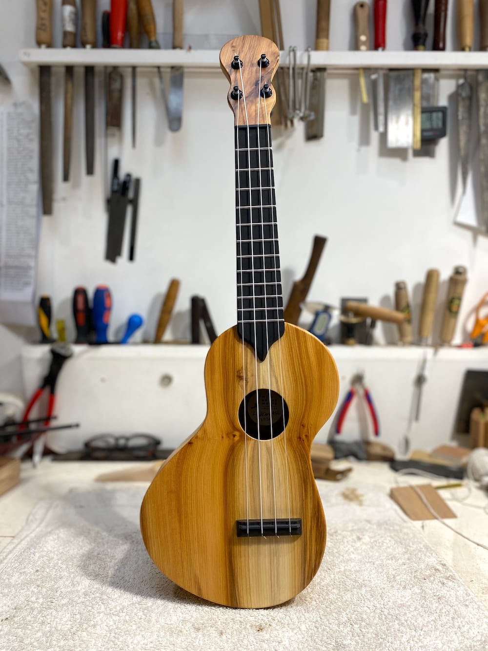 A stunning-looking and fantastic sounding all-yew concert Wonkylele. It may look peculiar but it's made to my usual high specifications and sounds great. The askew angle of the neck actually makes it easier to play because the player's wrist is in a more natural position.