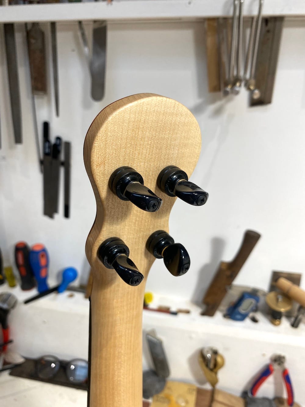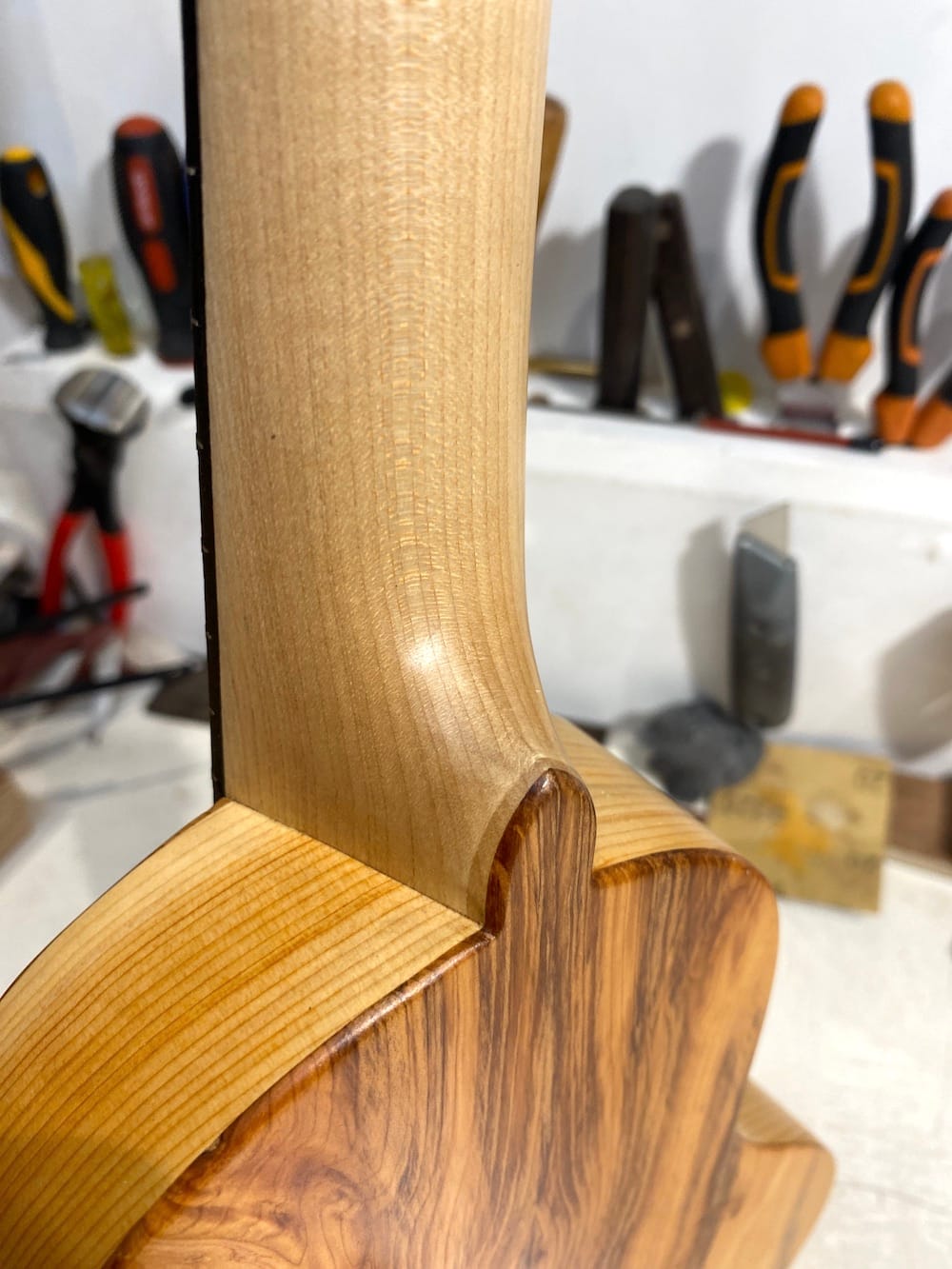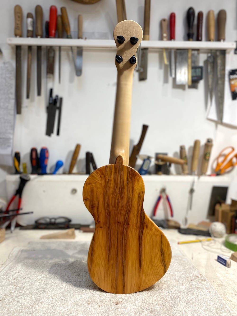 This wonderfully patterned yew is reclaimed from a storm at a botanical garden in East Sussex. Sycamore neck, real ebony bridge and fingerboard (offcuts from a local frame maker). Fitted with Gotoh UPT tuners and Aquila strings.