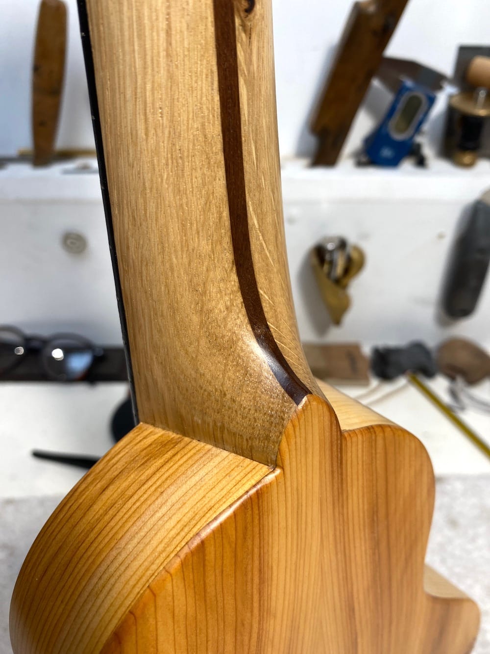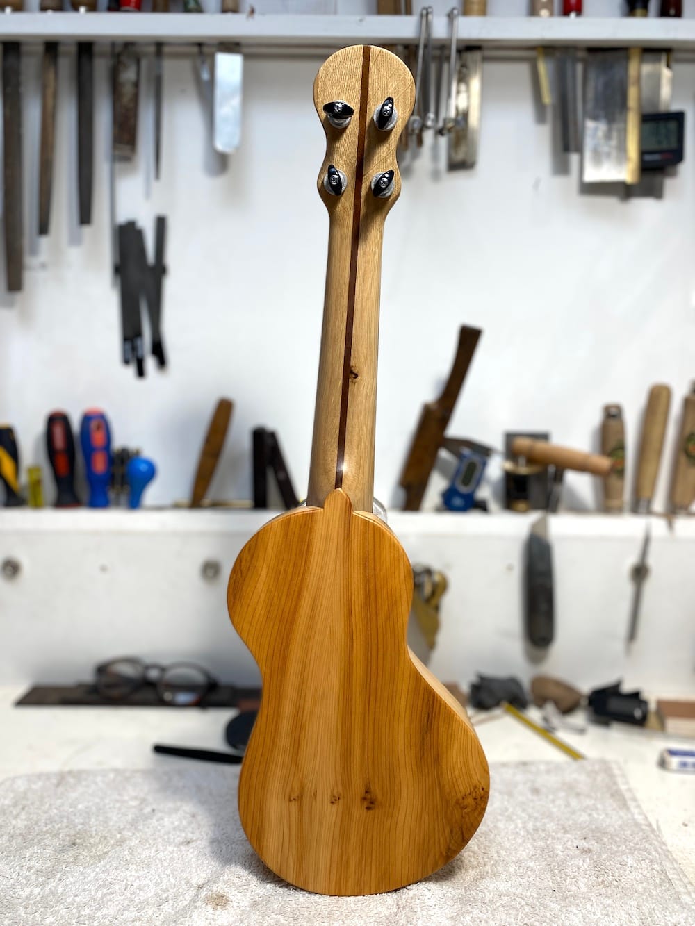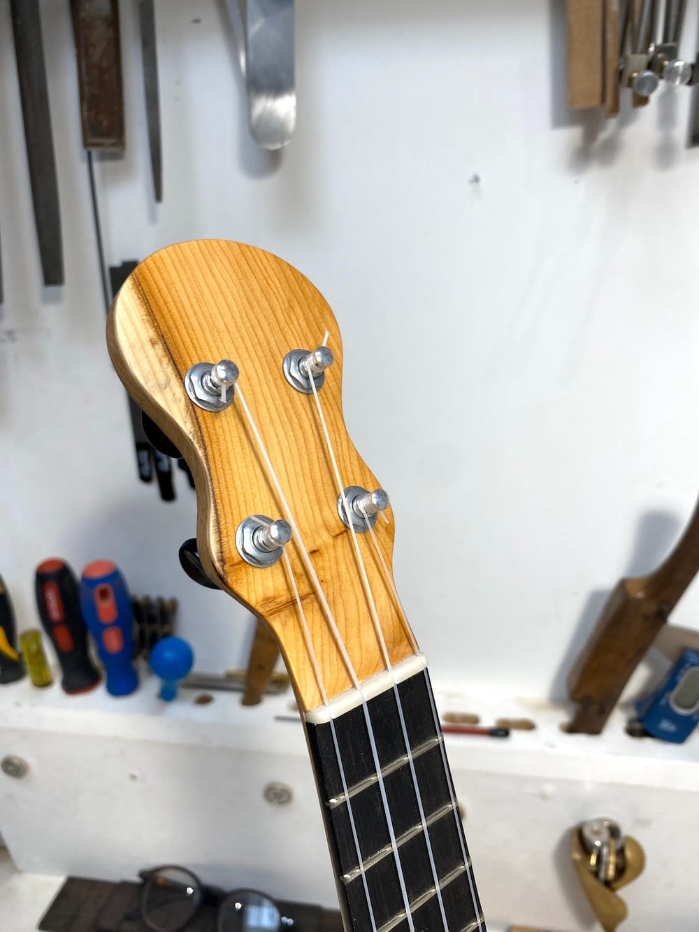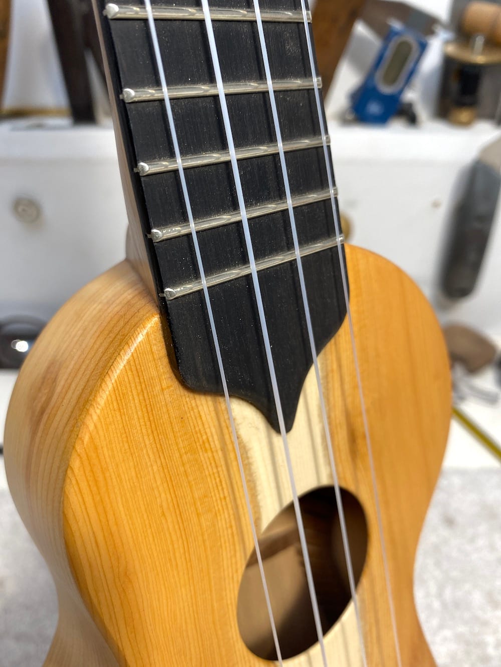 Wonkyleles may look peculiar but they're made to my usual high specifications and sound great. The askew angle of the neck actually makes it easier to play because the player's wrist is in a more natural position.