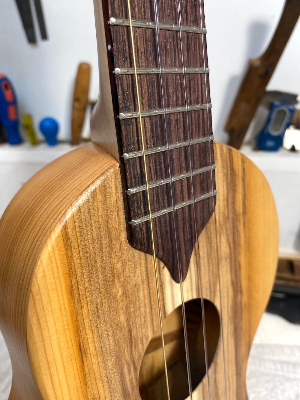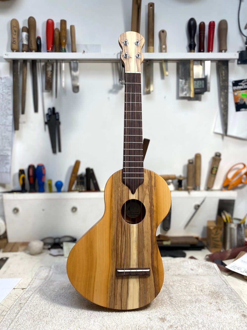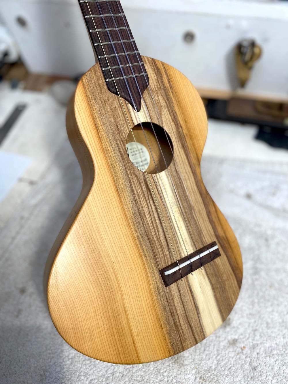 A beautiful and fantastic sounding yew tenor Wonkylele. It may look peculiar but it's made to my usual high specifications and sounds great. The askew angle of the neck actually makes it easier to play because the player's wrist is in a more natural position.