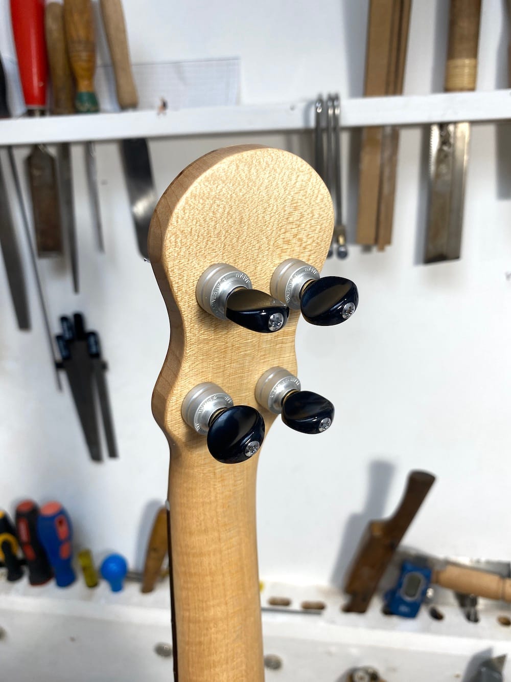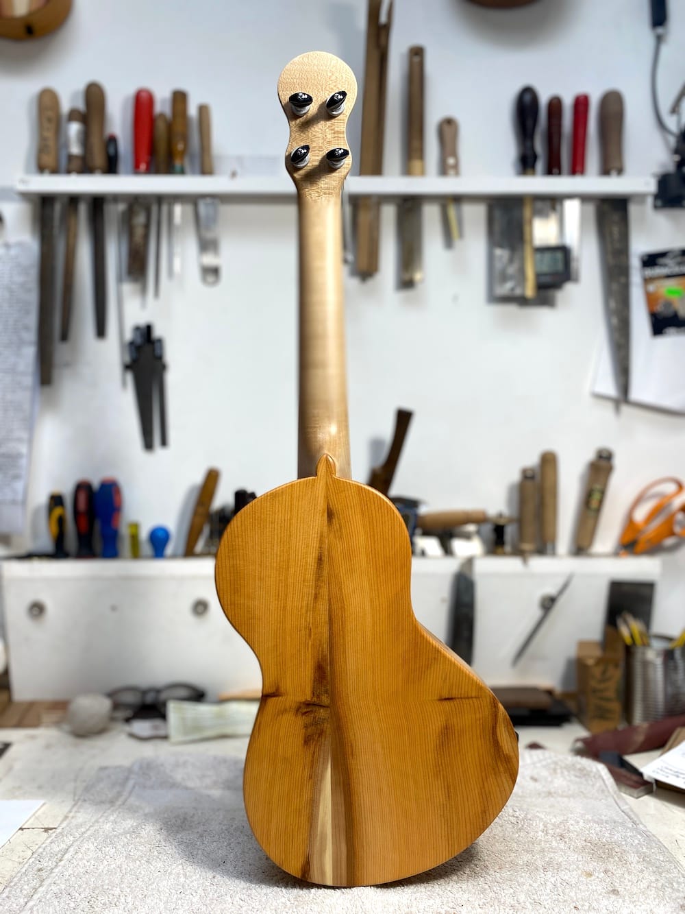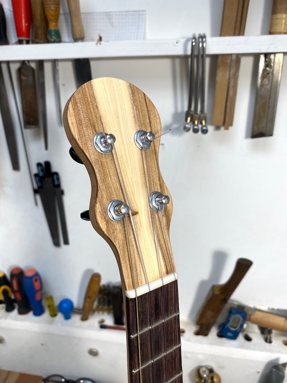 A beautiful and fantastic sounding yew tenor Wonkylele. It may look peculiar but it's made to my usual high specifications and sounds great. The askew angle of the neck actually makes it easier to play because the player's wrist is in a more natural position.