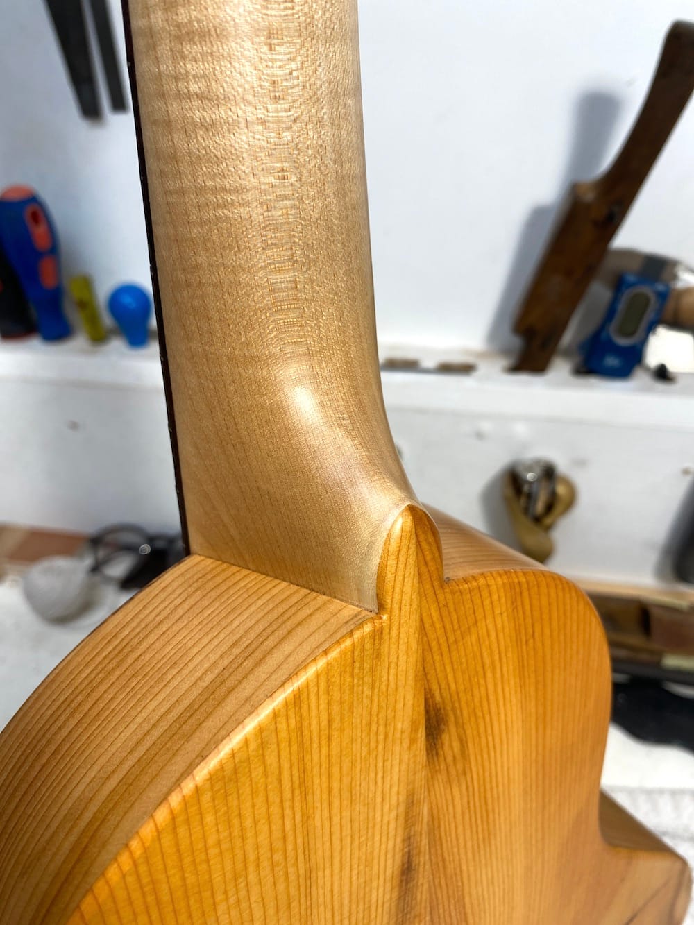 This wonderfully patterned yew is reclaimed from a storm at a botanical garden in East Sussex. Sycamore neck, real rosewood bridge and fingerboard. Fitted with fantastic Gotoh UPT tuners and fluorocarbon strings with a low G.
